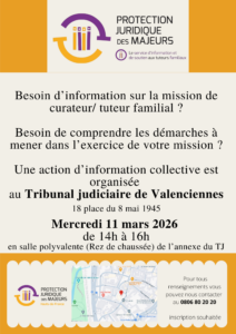 Le Service d’Information et de Soutien aux Tuteurs Familiaux vous propose un temps d’information collective organisé au tribunal judiciaire de Valenciennes.